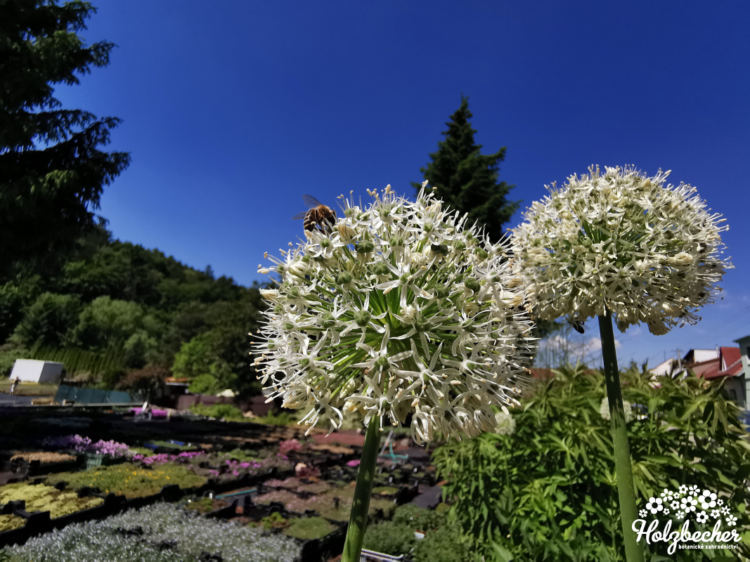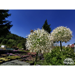Okrasný česnek vysoký 60 - 70 cm, květy jsou bílé se zeleným středem. Doba kvetení V - VI. Vyžaduje
