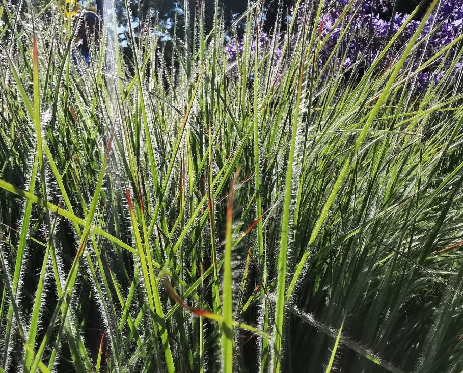 Ziergras, 120 cm, aufrechter Wuchs, blau-grüne Blätter mit feinen Härchen, silbrig-weiße Blütenstände. Ideal für sonnige und gut durchlässige Böden.