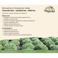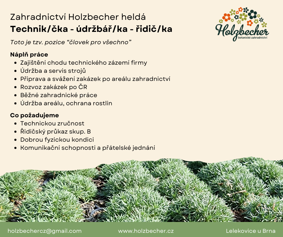 - Pro technické zázemí oceníme manuální zručnost a fyzickou zdatnost. Jedná se většinou o manuální práci venku, ochranu rostlin, mimo technickou údržbu také péči o rostliny a údržbu areálu. Příležitostný rozvor rostlin po ČR, práci se stroji a vysokozdvižným vozíkem.